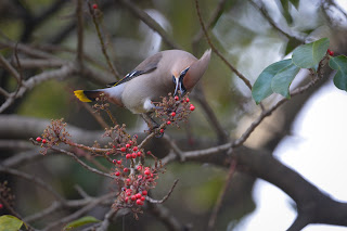 As I heard a news about a large flock of waxwings, I got up early in the morning and visited the park from 7:30 AM. There were already more than 30 birders. The waxwings were seen in the close distance, though it was too dark to take good quality photos. After I walked around the park, I briefly dropped in the small water pool. The waxwings visited in the small garden with good sun lights.